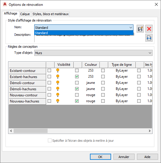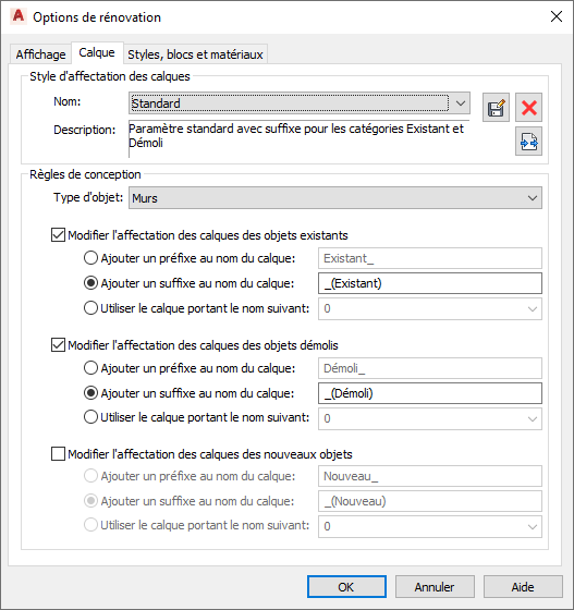 Modifier les règles de conception de rénovation à renommer ou réaffecter les calques pour les objets en fonction de leur type d'objet et des travaux de rénovation. Ces modifications sont enregistrées dans le dessin en cours.