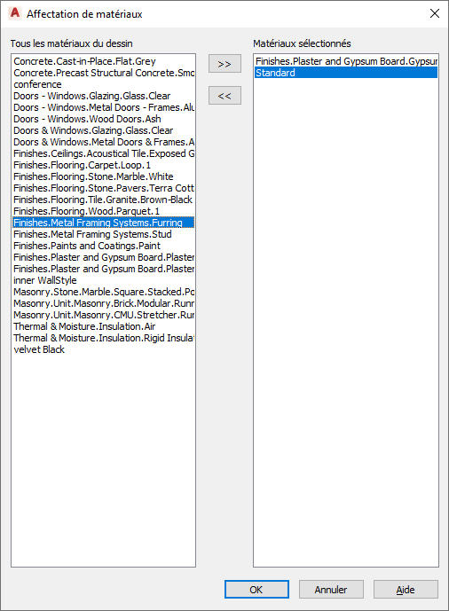 - Répertorie tous les matériaux définis dans AutoCAD qui sont disponibles dans le dessin.