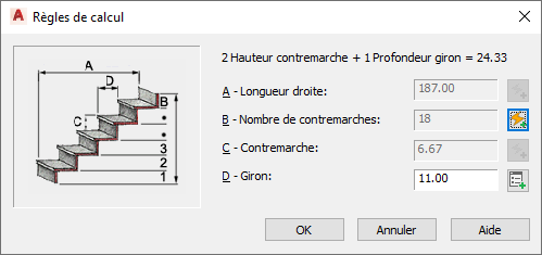 Certaines des cotes concernées peuvent être définies par l'utilisateur. D'autres sont définies de façon automatique. Cela dépend, en fait, de la combinaison des champs sélectionnés. Seules les combinaisons logiques sont disponibles lorsque le calculateur basé sur la règle est mis en service. Lorsque le calculateur basé sur la règle n'est pas en service, vous pouvez définir soit le giron, soit la longueur droite et soit le nombre de contremarches, soit la hauteur des contremarches.