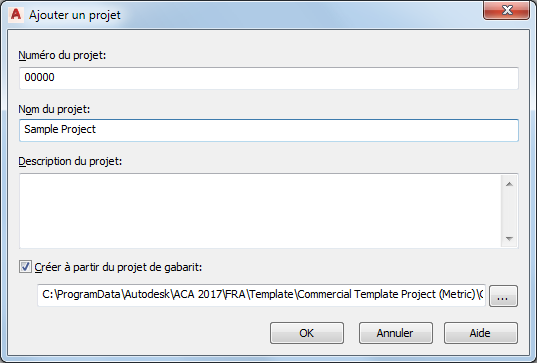 Remarque : Vous ne pouvez pas définir tous les fichiers de prise en charge et les chemins d'accès directement lorsque vous créez un projet. Vous pouvez uniquement définir le nom, le numéro, la description et le gabarit du projet. Les autres paramètres ne peuvent être spécifiés qu'une fois le projet créé. Si vous créez le projet d'après un gabarit, ses paramètres font office de paramètres initiaux.