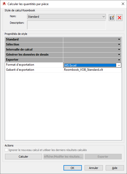 - Dans la boîte de dialogue Calculer les quantités par pièce, sous Propriétés de style, liste Exporter, sélectionnez MS Excel dans la liste Format d'exportation.