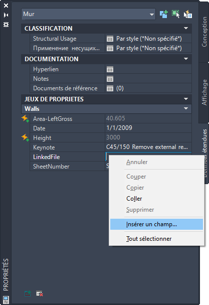 Pour ajouter un champ aux propriétés d'un objet donné, il suffit de créer une propriété manuelle sous forme de marque de réservation du champ. Celle-ci sera résolue en temps utile. Cette opération est particulièrement utile si vous souhaitez ajouter des informations différentes selon l'objet et nécessitant des mises à jour régulières.