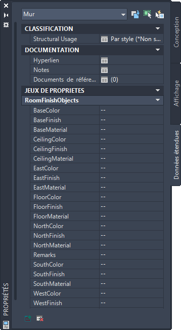 Remarque : La liste de la définition du jeu de propriétés dans l'onglet Données étendues peut être contrôlée à l'aide des options de la liste déroulante Remplacement de propriétés dans l'onglet Paramètres des objets AEC de la boîte de dialogue Options.