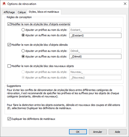 Modifier les règles de conception de rénovation automatiquement pour ajouter un préfixe ou un suffixe pour les styliser et les noms de bloc en fonction de leur catégorie de rénovation de l'objet. Si vous ne déterminez pas un préfixe ou un suffixe et que le même nom de style ou de bloc existe dans une autre catégorie du dessin, un avertissement s'affiche et vous avez la possibilité de saisir un nouveau nom manuellement.