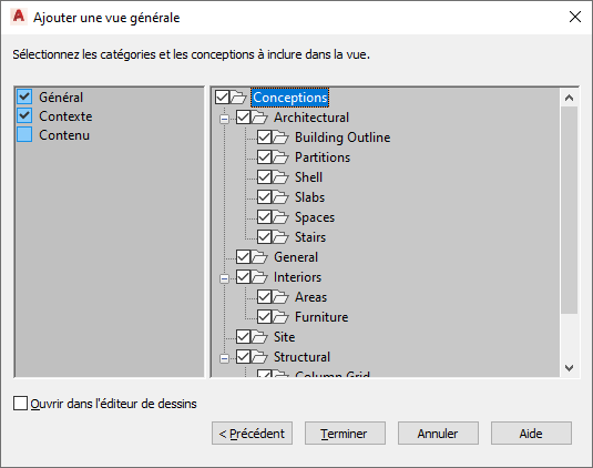 exclure une catégorie de dessin de vue | désactivez la case à cocher correspondant à la catégorie. Toutes les conceptions de cette catégorie sont alors automatiquement désactivées. |