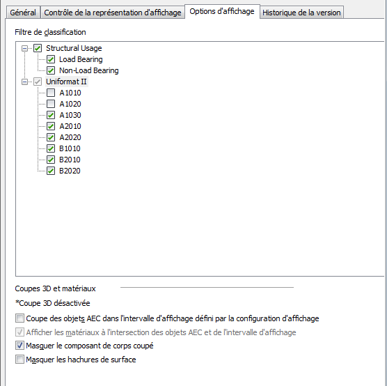 Par exemple, pour masquer toutes les portes et tous les murs A1010 et A1020, désactivez les cases à cocher A1010 et A1020 sous Uniformat II.