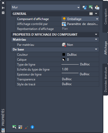 Comme l'onglet Conception de la palette des propriétés, l'onglet Affichage permet de définir les propriétés graphiques d'un objet en ajustant les paramètres de chacun de ses composants (par exemple, les contours et les hachures). Les modifications apportées dans cet onglet se reflètent immédiatement dans la représentation d'affichage active (par exemple, Plan ou Modèle). Vous avez également la possibilité d'appliquer ces modifications aux autres représentations d'affichage. De plus, contrairement aux paramètres de l'onglet Conception, qui s'appliquent uniquement aux objets sélectionnés, les propriétés définies dans l'onglet Affichage peuvent s'appliquer au composant sélectionné pour l'ensemble des objets de ce type ou de ce style, ou uniquement pour l'objet sélectionné. Si le composant d'affichage est contrôlé par un matériau, les modifications s'appliquent à tous les objets utilisant ce matériau.