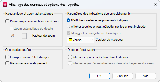 Vous pouvez configurer le programme pour qu'il sélectionne automatiquement les objets graphiques du dessin lorsque des enregistrements supplémentaires sont sélectionnés dans la fenêtre Affichage des données. A l'inverse, vous pouvez configurer le programme pour sélectionner des enregistrements de base de données liées lorsque des objets graphiques supplémentaires sont sélectionnés dans le dessin. Toutefois, un seul de ces modes d'affichage automatique peut être actif à la fois.