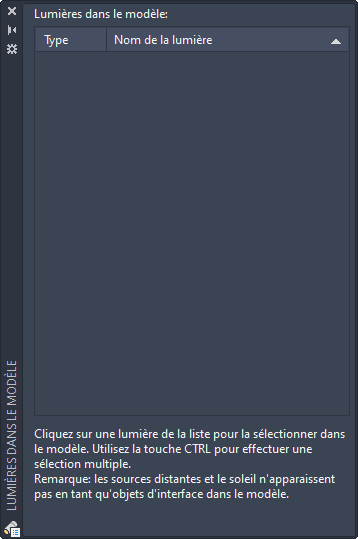 Une icône dans la colonne Type indique le type de lumière : source ponctuelle, source dirigée ou source distante et si cette source est allumée ou éteinte. Choisissez une lumière dans la liste pour la sélectionner dans le dessin. Pour trier la liste, cliquez sur l'en-tête de colonne Type ou Nom.