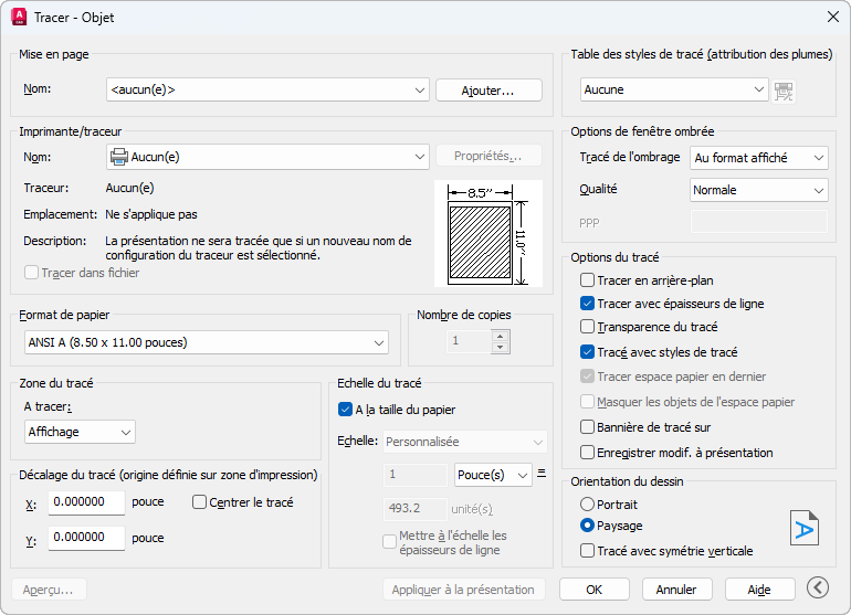 Sélectionnez le format de papier, la zone du tracé, l'échelle du tracé, l'orientation et d'autres options.