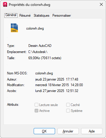 Affiche des informations en lecture seule fournies par le système d'exploitation concernant le fichier de dessin.