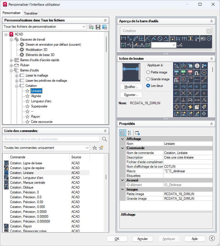 Fournit une interface de personnalisation des espaces de travail, barres d'outils, menus, groupes de fonctions du ruban, menus contextuels et autres éléments de l'interface utilisateur.