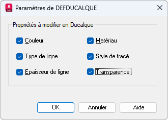 Modifie les remplacements de propriétés des paramètres de couleur, de type de ligne, d'épaisseur de ligne, de matériau, de style de tracé et de transparence en DuCalque pour les objets sélectionnés et les blocs insérés sur des calques non verrouillés.