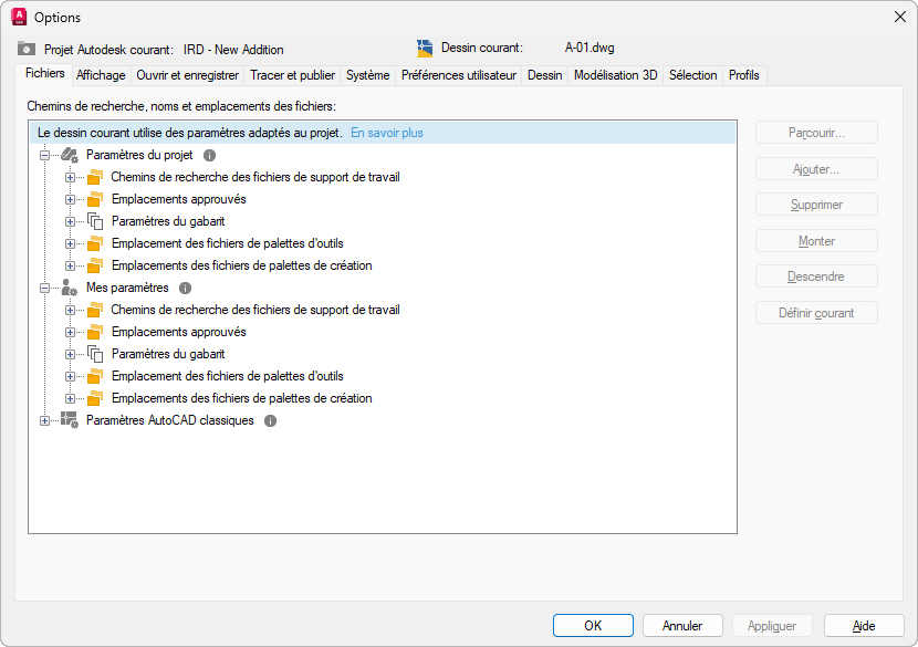 Pour plus d’informations sur la modification des chemins d’accès aux fichiers de support connectés, reportez-vous à la section Définir les chemins d’accès aux fichiers de support connectés d’un projet Autodesk Docs.
