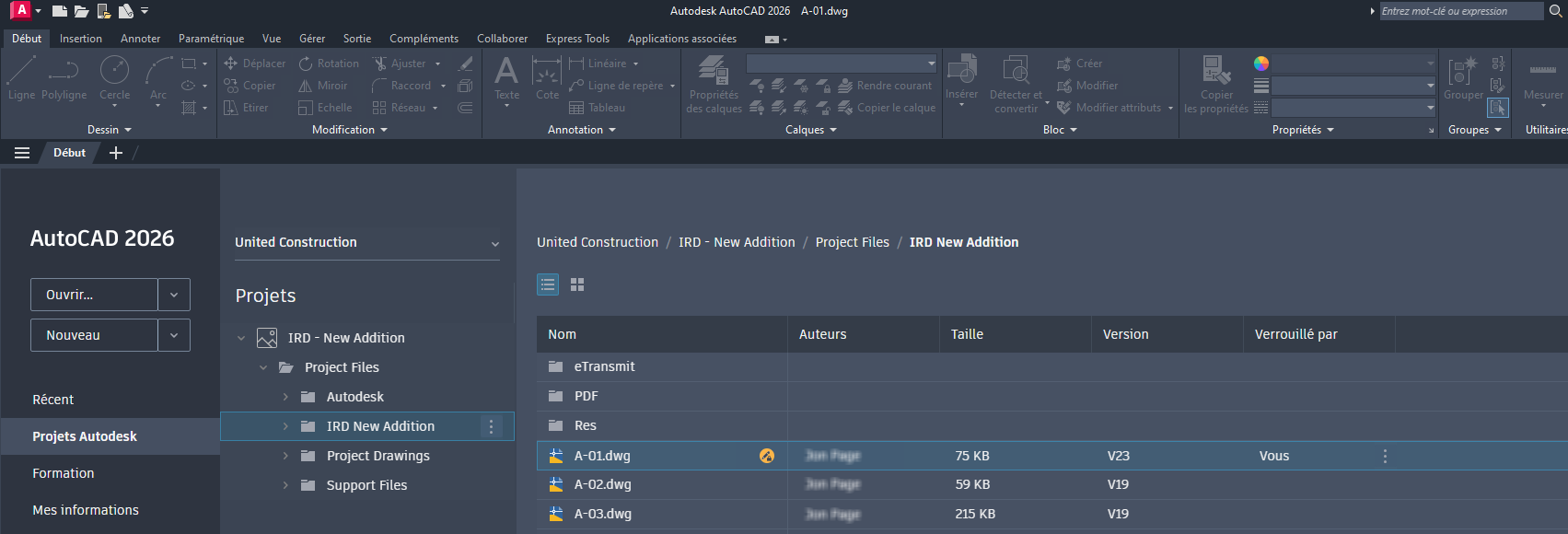 - Une fois que vous avez sélectionné un projet initial dans Desktop Connector, dans AutoCAD, sur la page Démarrer, cliquez sur Projets Autodesk.
