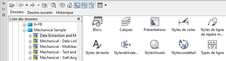 L'arborescence de la partie gauche de la fenêtre DesignCenter et les onglets DesignCenter permettent de rechercher un contenu et de le charger dans la zone de contenu.