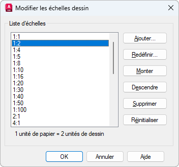 Affiche la liste des échelles actuellement définies. Affiche également des échelles temporaires qui sont importées au moment où des xréfs sont attachées. Si le nom d'une échelle est en double, mais que sa valeur est différente, un numéro est ajouté au nom.