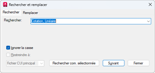 Limite la recherche au fichier CUIx sélectionné dans la liste déroulante. Par défaut, le fichier CUIx principal ( acad.cuix pour AutoCAD ou acadlt.cuix pour AutoCAD LT) est recherché.