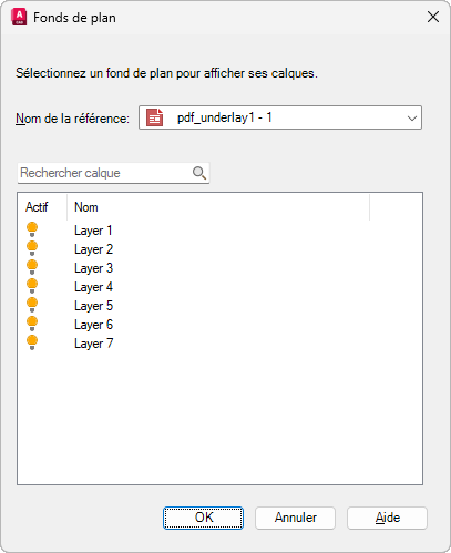 Utilisez la commande CALQUESDWF, CALQUESPDF, CALQDGN ou CALQUESJ, ou cliquez avec le bouton droit de la souris sur un calque sous-jacent sélectionné et choisissez Calques dans le menu contextuel.