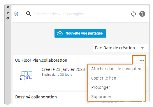 Démarre le processus de création d'une vue partagée. Affiche la boîte de dialogue Partager la vue avec plusieurs options. Ensuite, les données sont extraites du dessin afin de créer une vue qui sera provisoirement publiée à un emplacement de votre compte Autodesk Account Web et mobile, et un lien (que vous pouvez partager) vers cet emplacement est généré.