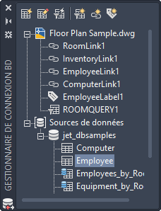 Le Gestionnaire de connexion BD est une fenêtre contenant un jeu de boutons et une arborescence qui peut être ancrée et redimensionnée. Il permet d'ouvrir la fenêtre Affichage des données afin de visualiser ou de modifier une table de base de données. Vous pouvez également associer divers objets de base de données (gabarits de liens, d'étiquettes et requêtes, etc.) avec un dessin.