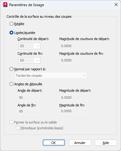 Ferme et ouvre une surface ou un solide Lorsque cette option est utilisée, les coupes doivent former une forme en tore de manière à ce que le solide ou la surface lissé puisse former un tube fermé (variable système LOFTPARAM)