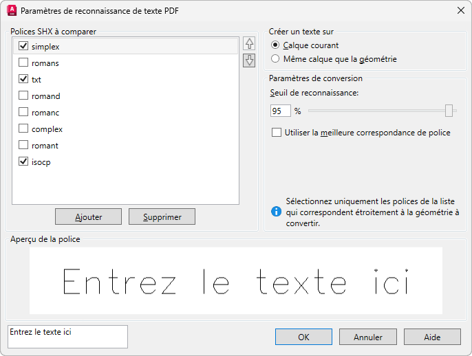 Affiche la liste des polices SHX dans laquelle vous pouvez choisir les plus susceptibles de correspondre à la géométrie SHX. L'ordre des polices SHX sélectionnées est important. Les polices sélectionnées sont comparées à la géométrie SHX sélectionnée pour trouver une correspondance à partir du haut de la liste, jusqu'à ce que le seuil ait été atteint ou dépassé. Utilisez les flèches pour déplacer une police sélectionnée vers le haut ou le bas de la liste. Les polices qui ne sont pas cochées sont ignorées. Veuillez noter les points suivants :