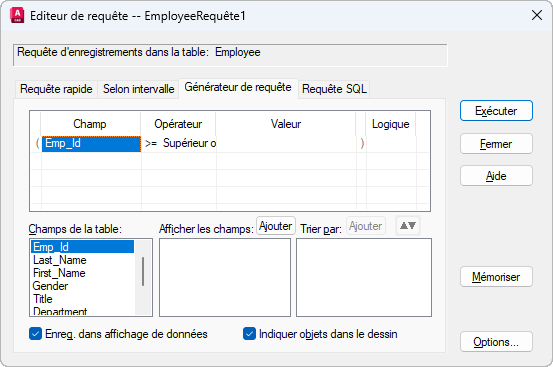 Affiche la liste des champs disponibles à partir de la table de base de données courante, dans laquelle vous pouvez choisir les champs à afficher dans la fenêtre Affichage des données lors de l'exécution de la requête. Si vous ne désignez pas les champs à afficher, la requête renvoie tous les champs de la table de base de données. Si vous cliquez deux fois sur un champ de cette liste ou sélectionner un champ, puis sur Ajouter (afficher les champs), vous ajoutez le champ à ceux affichés dans la fenêtre Affichage des données une fois la requête exécutée. Vous pouvez aussi faire glisser des champs dans les zones Afficher les champs et Trier par.