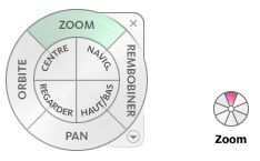 Lorsqu'un des disques de navigation complète est affiché, vous pouvez maintenir le bouton central de la souris enfoncé pour effectuer un panoramique, maintenir ce bouton central, ainsi que la touche MAJ enfoncés pour appliquer l'orbite au modèle ou bien utiliser la molette pour effectuer un zoom avant ou arrière.