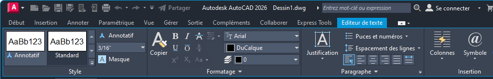 Le ruban offre une palette compacte comprenant tous les outils nécessaires à la création ou la modification d'un dessin. Il peut être placé aux endroits suivants :