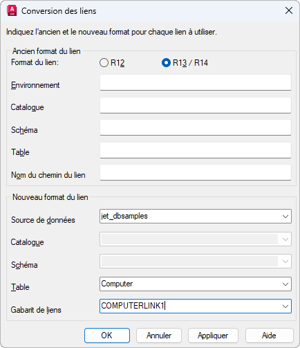 Indique le format du lien que vous convertissez. Des champs différents s'affichent, selon que vous sélectionnez R12 ou R13/R14.