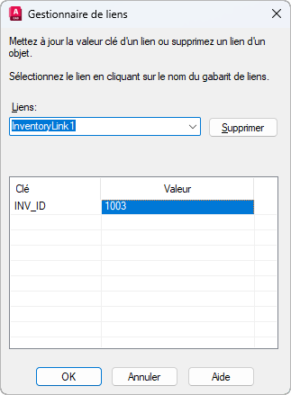 Affiche toutes les valeurs clés définies pour le lien sélectionné. Pour afficher la liste des valeurs correspondant à un champ spécifique, cliquez sur une cellule Valeur et choisissez [...].