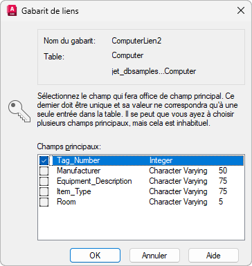 Affiche tous les champs disponibles pour la table de base de données courante, ainsi que le type de champ et, pour les champs de caractères, la longueur de champ. Pour spécifier les champs clés du gabarit de liens, sélectionnez la case à cocher située à gauche du nom de champ.
