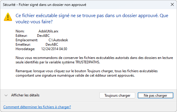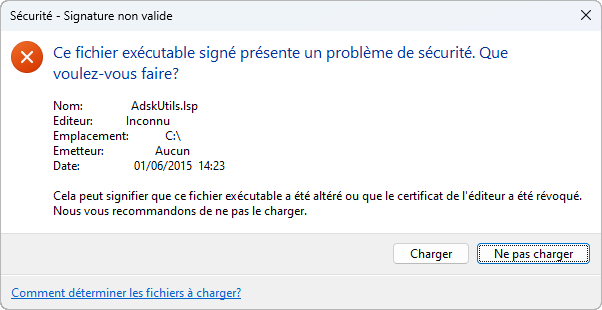Lorsque vous chargez un fichier programme signé numériquement, le programme basé sur AutoCAD ou AutoCAD LT en vérifie la signature numérique. Selon que la signature numérique a pu être vérifiée ou non, un message autorisant ou refusant le chargement du fichier dans l'environnement de dessin apparaît.