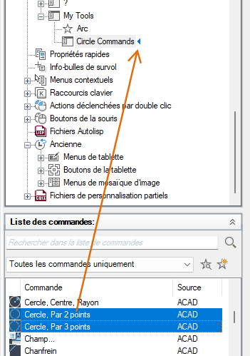 7. Dans le volet Liste des commandes, faites glisser la commande que vous voulez ajouter au sous-menu dans le volet Personnalisations dans <nom de fichier>.