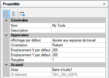 Remarque : Les modifications apportées ici aux propriétés d'une barre d'outils concernent uniquement l'apparence initiale de la barre d'outils après le chargement du fichier de personnalisation (CUIx). Il est recommandé d'utiliser un espace de travail pour contrôler l'apparence d'une barre d'outils.