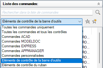 Le volet Liste des commandes affiche uniquement la liste des éléments de contrôle de la barre d'outils.
