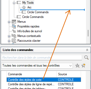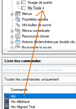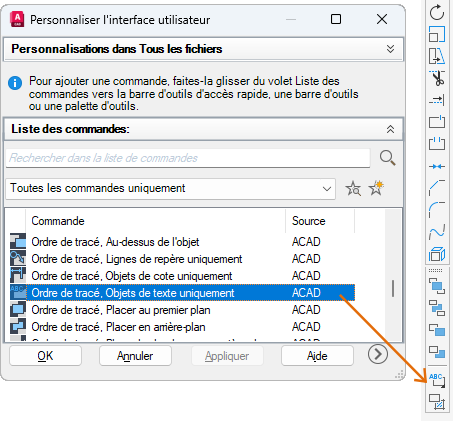 4. Dans le volet Liste des commandes, faites glisser la commande que vous voulez ajouter à la barre d'outils dans le volet Personnalisations dans <nom de fichier>.