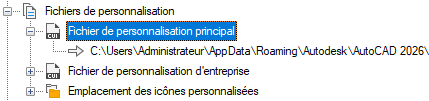 - Dans l'Explorateur de fichiers, accédez à l'emplacement suivant : <lecteur>:\Users\<nom du profil utilisateur>\AppData\Roaming\Autodesk\<nom du produit>\<numéro de version>\<langue>\support\<nom du fichier de personnalisation>.cuix.