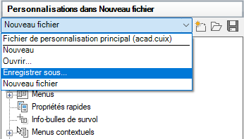 Toutes les nouvelles commandes sont ajoutées directement au fichier CUIx de travail. Si le fichier CUIx que vous souhaitez utiliser n'est pas chargé, sélectionnez Ouvrir dans la liste déroulante Fichiers de personnalisation. Ensuite, parcourez les fichiers et sélectionnez celui de votre choix.