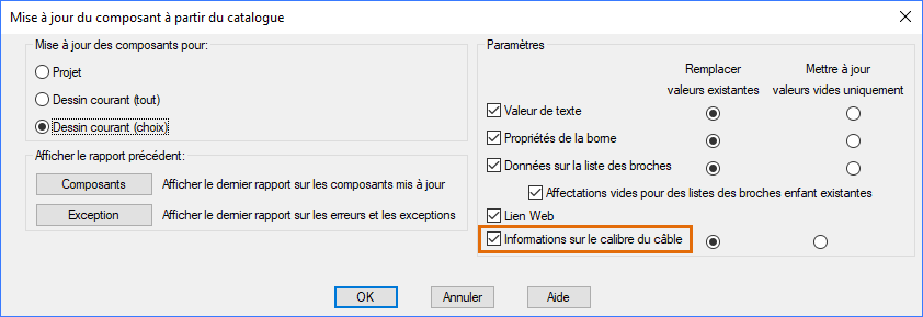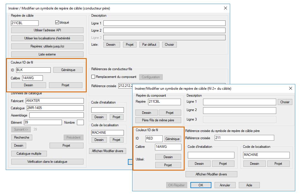 Les symboles de repères de câble de la bibliothèque schématique de toutes les normes existantes sont désormais mis à jour pour inclure l’attribut TENSION NOMINALE2. Cet attribut permet d’afficher des informations sur le calibre soit à partir de la liste des conducteurs définis dans les données du catalogue, soit à partir d’une valeur saisie manuellement.