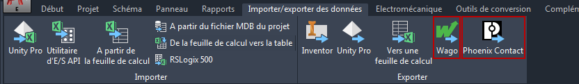 Vous pouvez exporter des borniers à partir d'Jeu d’outils AutoCAD Electrical et les importer dans les applications Wago ou Phoenix Contact pour concevoir, manipuler et valider les borniers.