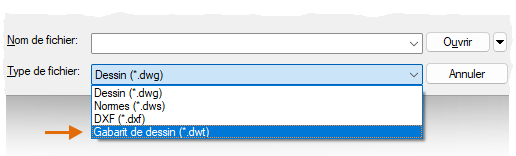 Si vous travaillez de façon indépendante, vous pouvez créer vos fichiers de gabarit de dessin en fonction de vos habitudes de travail. Vous pouvez ajouter les paramètres d'autres fonctions à mesure que vous vous familiarisiez avec elles. Pour modifier un fichier gabarit de dessin existant, cliquez sur Ouvrir, spécifiez le format Drawing Template (*.dwt) dans la boîte de dialogue Sélectionner un fichier, puis sélectionnez le fichier gabarit de dessin.