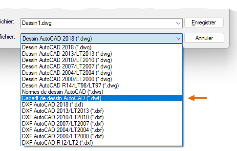 Vous pouvez enregistrer un fichier dessin (.dwg) en tant que fichier de gabarit de dessin (.dwt). Pour créer un fichier gabarit de dessin à partir d'un fichier existant, ouvrez le fichier gabarit de dessin existant, modifiez-le, puis réenregistrez-le sous un autre nom.