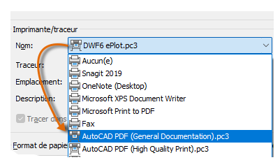 Dans la liste déroulante Imprimante/traceur, choisissez PDF AutoCAD (documentation générale).pc3 :