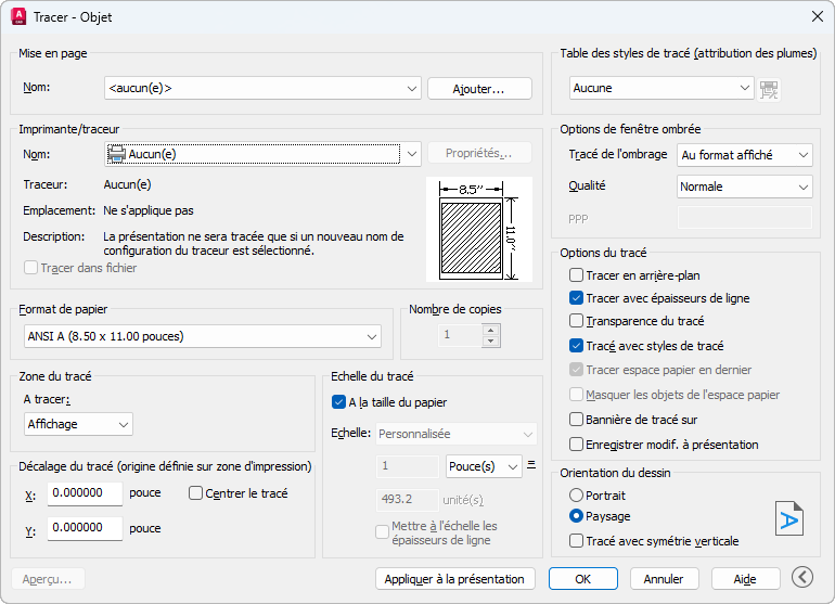 Effectuez la sortie d'une présentation de dessin sur un traceur, une imprimante ou dans un fichier. Enregistrez et restaurez les paramètres de l'imprimante pour chaque présentation.