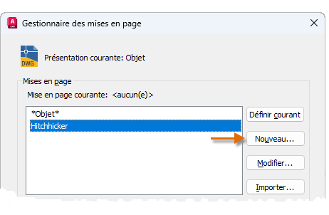 Pour ouvrir le Gestionnaire des mises en page, cliquez avec le bouton droit de la souris sur l'onglet Objet ou sur un onglet de présentation, puis choisissez Gestionnaire des mises en page. La commande correspondante est MISENPAGE.
