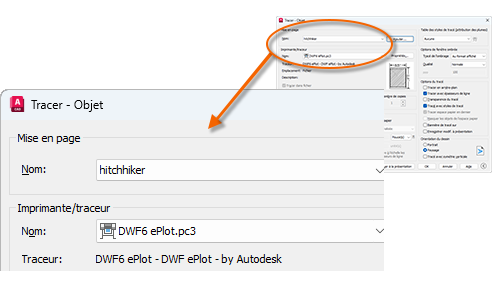 Lorsque vous êtes prêt à effectuer le tracé, il suffit de spécifier le nom de la mise en page dans la boîte de dialogue Tracer pour que tous les paramètres de tracé soient rétablis. Dans l'illustration suivante, la boîte de dialogue Tracer est configurée pour utiliser la mise en page Hitchhiker, ce qui permet de générer un fichier DWF (Design Web Format) au lieu d'effectuer l'impression dans un traceur.