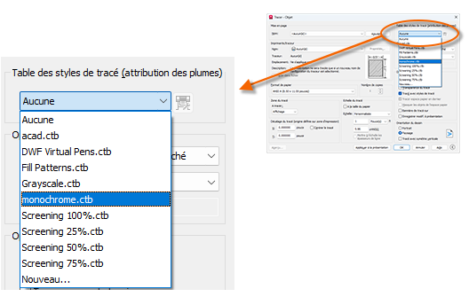 La table des styles de tracé fournit des informations sur le traitement des couleurs. Les couleurs qui offrent un bel effet sur votre écran peuvent ne pas convenir à un fichier PDF ou à l'impression. Vous pouvez par exemple créer un dessin en couleurs, mais aussi une sortie monochrome. La procédure à respecter pour définir une sortie monochrome est la suivante :