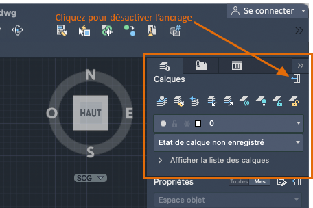 Pour voir comment un dessin est organisé, utilisez la palette des calques. Par défaut, la palette des calques est ancrée sur le côté droit, au-dessus de l'Inspecteur des propriétés. Désactivez l'ancrage de la palette pour redimensionner la palette et ses colonnes séparément.
